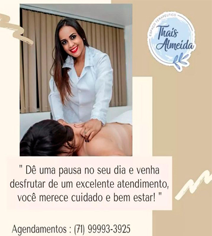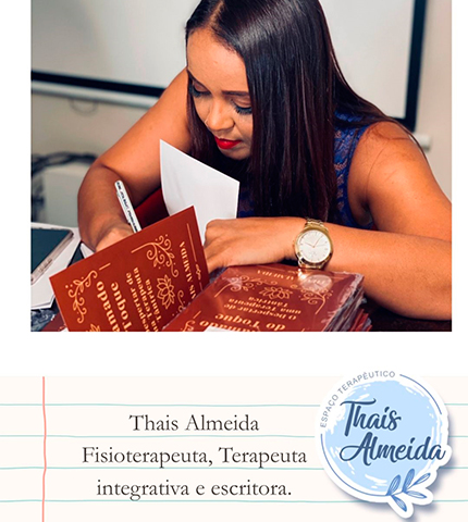 Olá Me chamo Thaís Almeida, sou fisioterapeuta, massoterapeuta e terapeuta integrativa, com mais de 10 anos de experiência na área do cuidado, bem-estar e saúde.